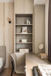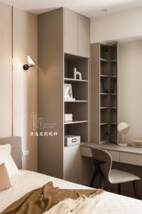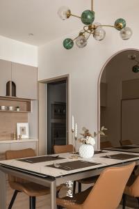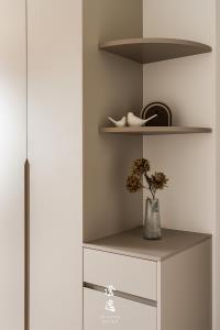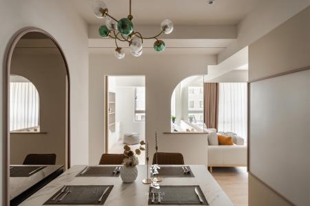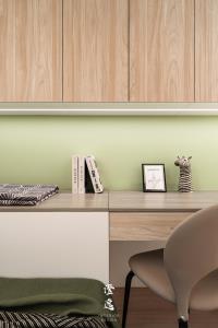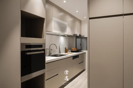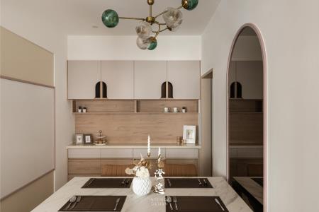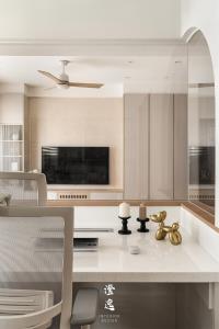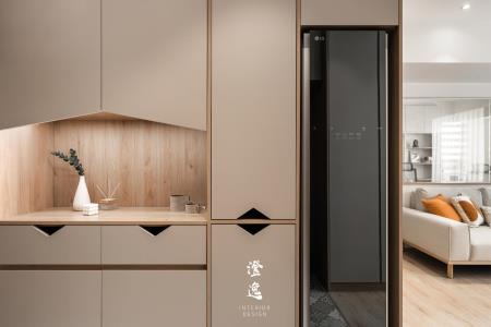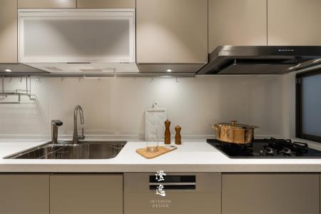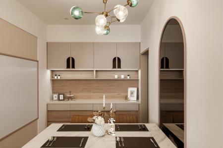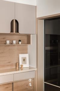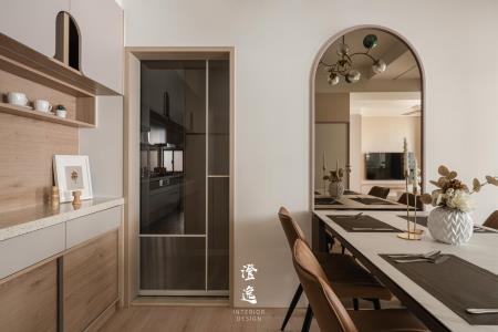 推門而入,客製木皮滑門的細膩紋理在指尖流轉,木質的呼吸與線條,讓每一次開合都多了一份靜謐的儀式感。視線延伸,茶鏡映著柔和光影,金屬邊框勾勒出純粹線條,讓餐廳與廚房之間多了優雅的連結與流動。
