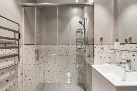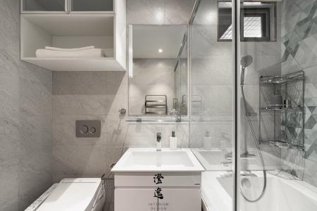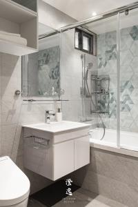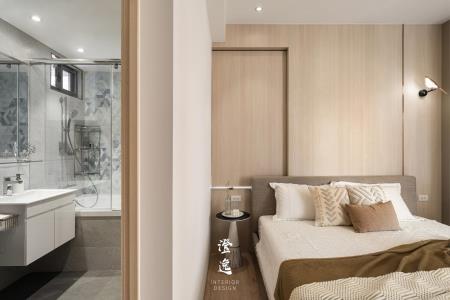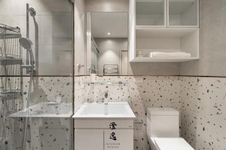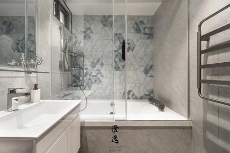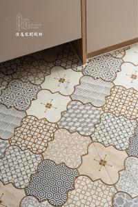 走進浴室,六角跳色的瓷磚如水波般鋪展,深淺交織映照著微光,讓洗去塵囂的片刻,也化作一幅靜謐的藝術。