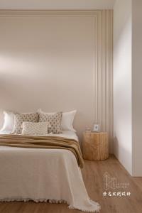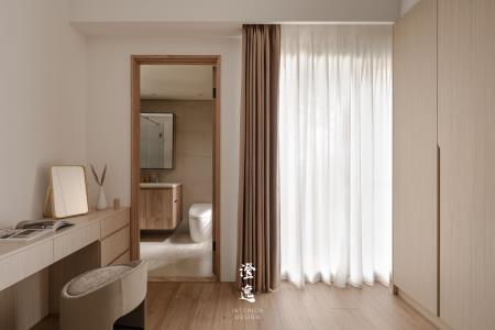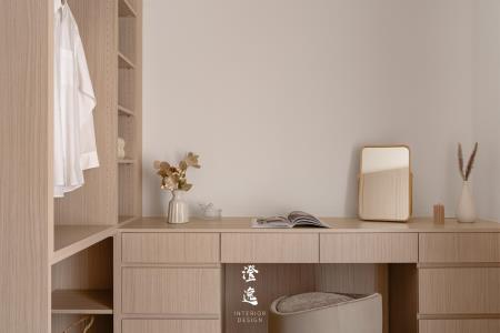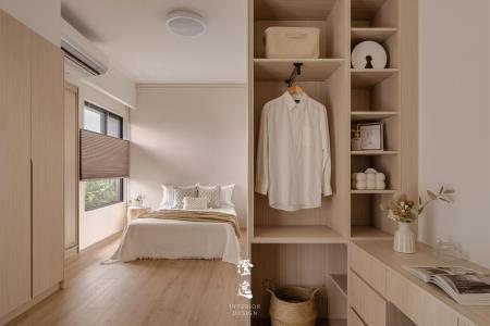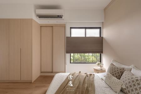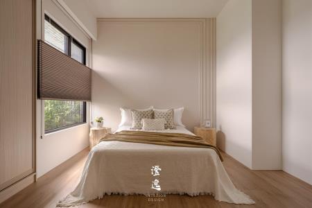 在主臥,牆面以珊瑚塗料鋪展,不只是視覺上的柔美,更蘊含功能性的安心守護。它能分解甲醛、除臭除溼,並具備耐燃特性,在美感之外,也為居住者築起一層無形的保護。