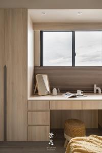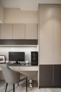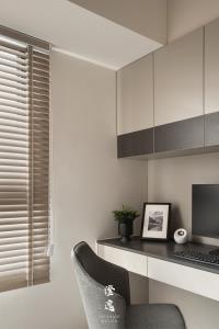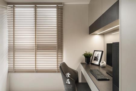 書房以柔和配色與俐落比例輕描出一隅靜境,雙色系統櫃襯托出理性與靜謐的平衡。百葉間灑落的日光,在桌面與筆尖間流轉,讓思緒靜靜發展,靈感悄然生長。